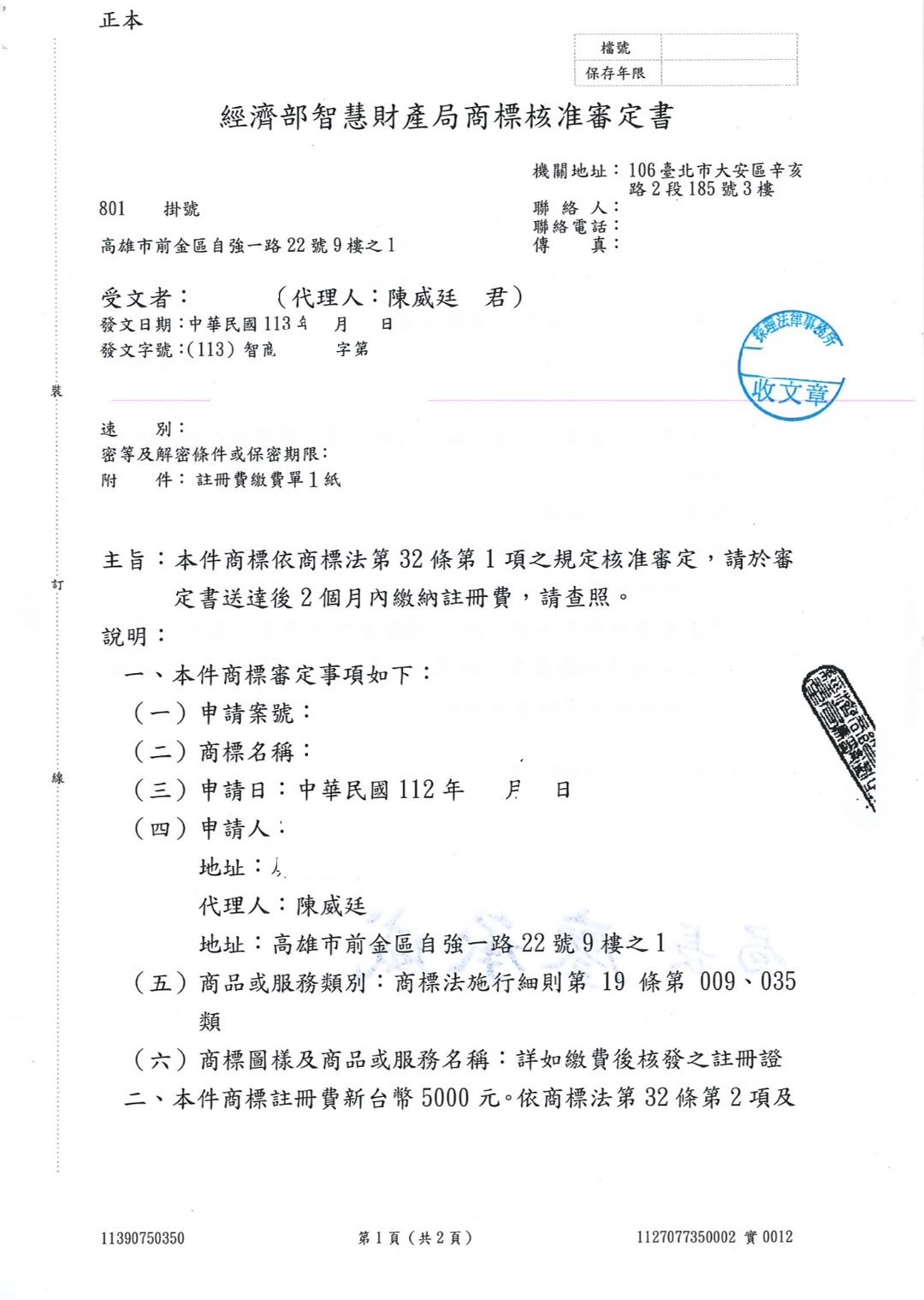 客戶欲經營某商業行為,想要註冊商標供使用,經代為向智慧財產局申請,順利取得商標註冊登記!